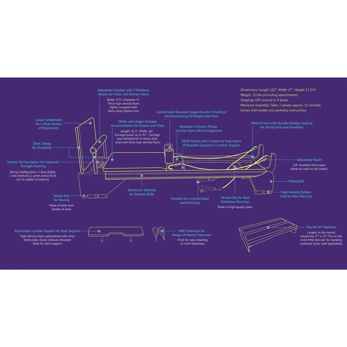 - All attachments are included with purchase: Jumpboard, Lumbar Support, Footbar, Shoulder Rolls, Ropes, Handles and Foot Straps.